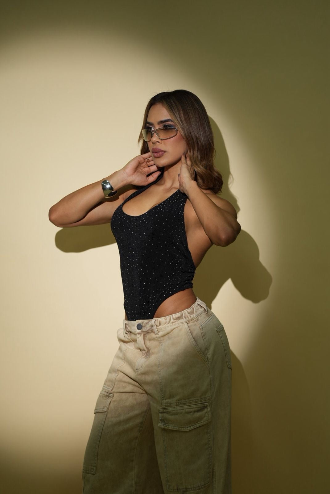 Body de amarrar con tiro elevado que resalta la figura mediante detalles brillantes estratégicamente distribuidos. Su diseño sofisticado fusiona sensualidad con elegancia, ofreciendo un acabado luminoso que atrae la mirada. Confeccionado para momentos donde deseas proyectar confianza y distinción. La combinación de su corte favorecedora y efectos brillantes lo convierte en una pieza versátil para ocasiones especiales.