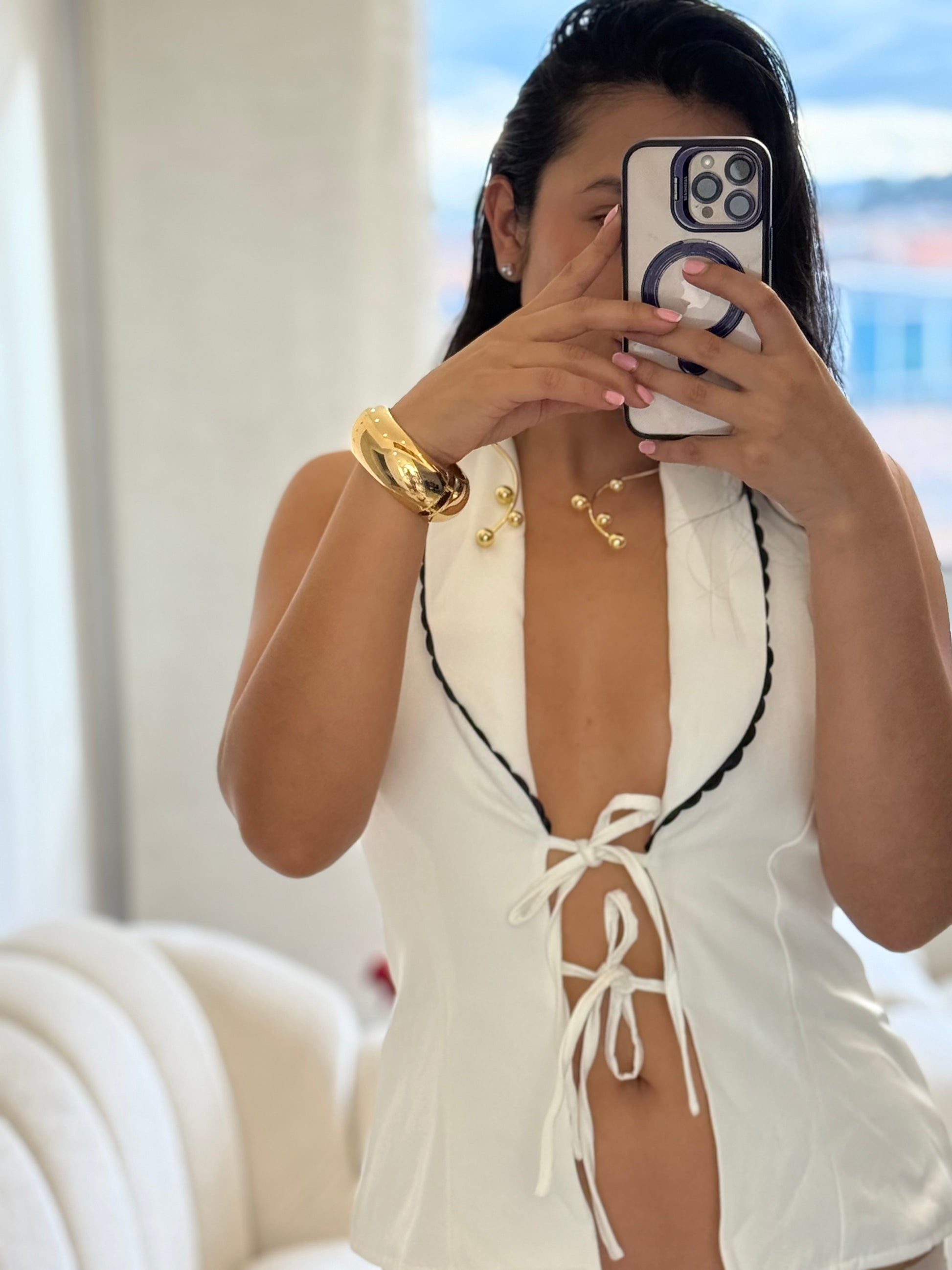 Este chaleco de amarre frontal combina delicadeza y sensualidad con un diseño elegante que realza tu figura. Su cuello halter aporta un toque sofisticado y moderno, perfecto para complementar cualquier look con distinción y estilo. Ideal para quienes buscan un equilibrio entre comodidad y tendencia.