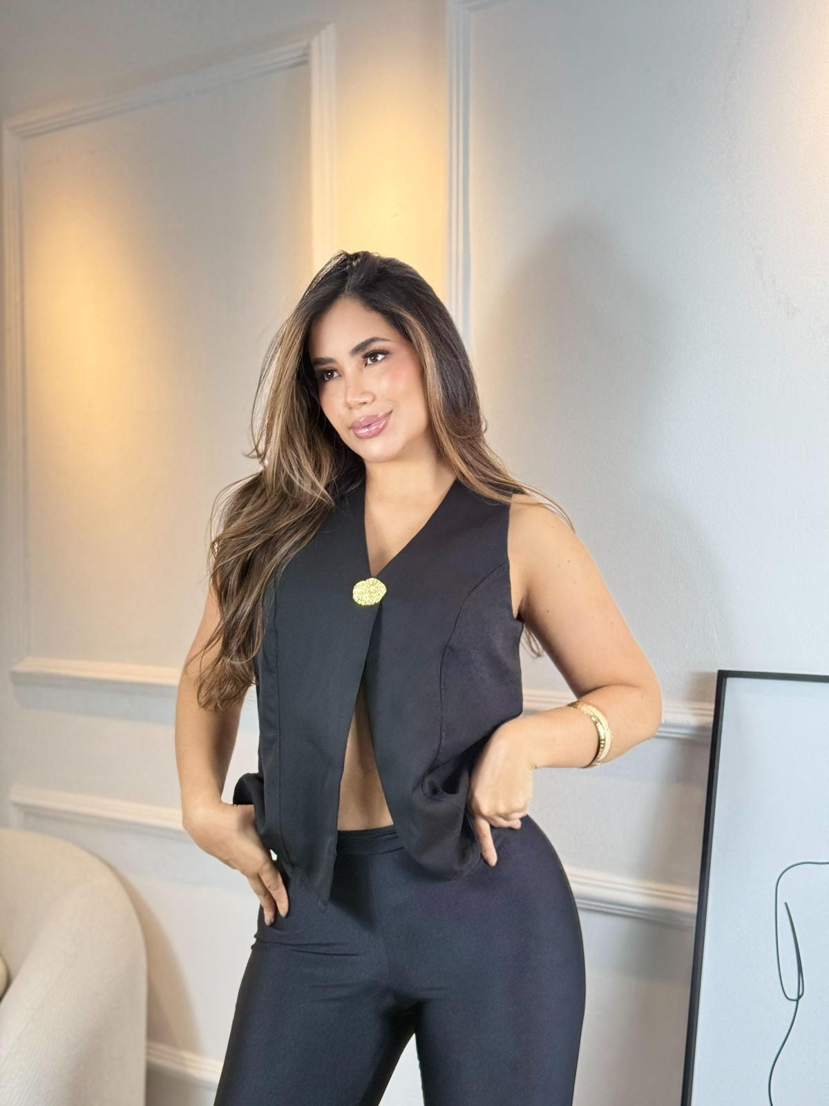 Este chaleco está confeccionado en telas de alta calidad de Noches de Viena, con doble capa que garantiza durabilidad y un acabado impecable. Su elegante detalle dorado añade un toque distintivo y refinado, ideal para complementar looks sofisticados con un estilo único y exclusivo.