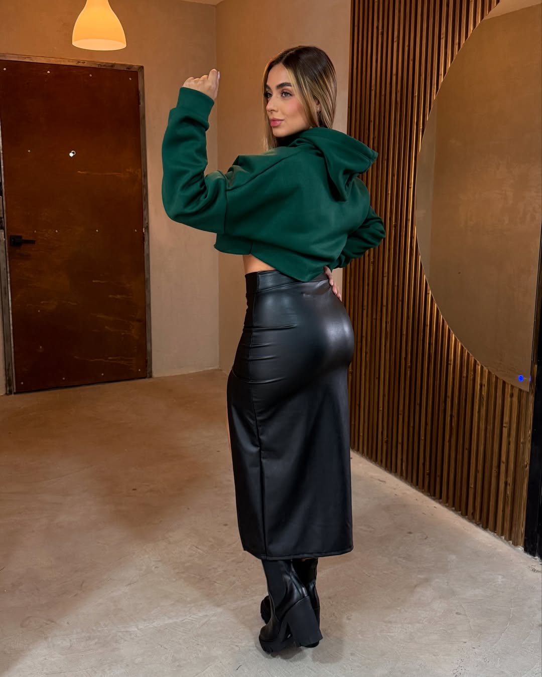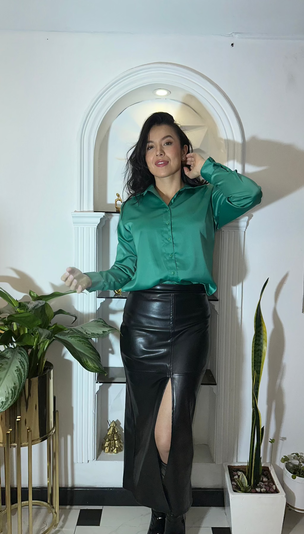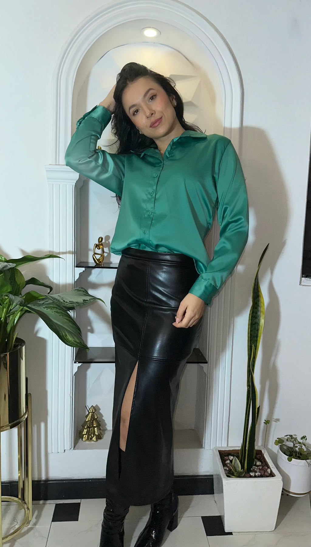 Conquista miradas con esta falda en efecto cuero negro, diseñada con una sensual abertura frontal que añade movimiento y estilo. Su corte ajustado realza la silueta y su acabado brillante le da un toque sofisticado y atrevido. Ideal para looks elegantes, urbanos o de noche.