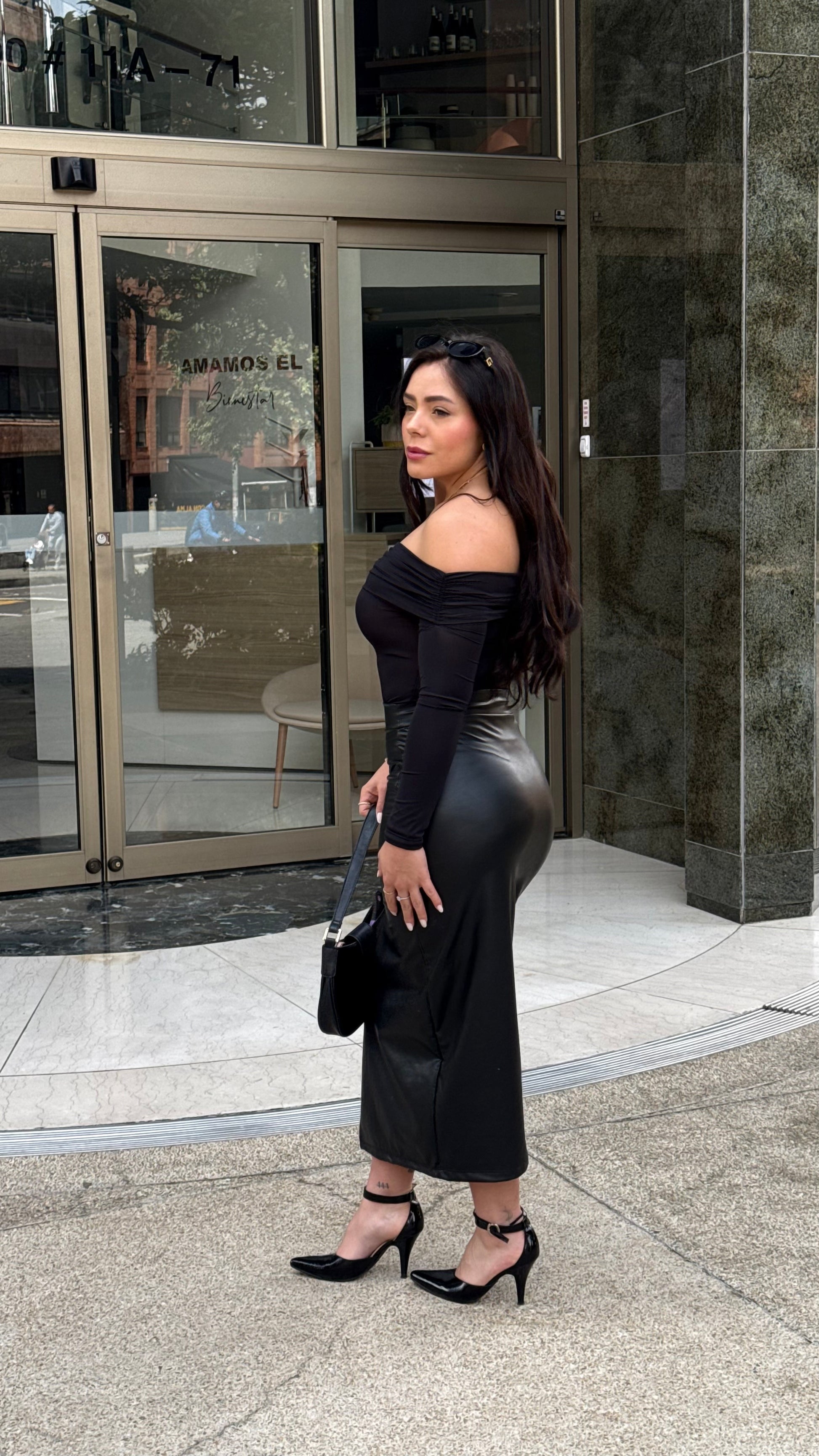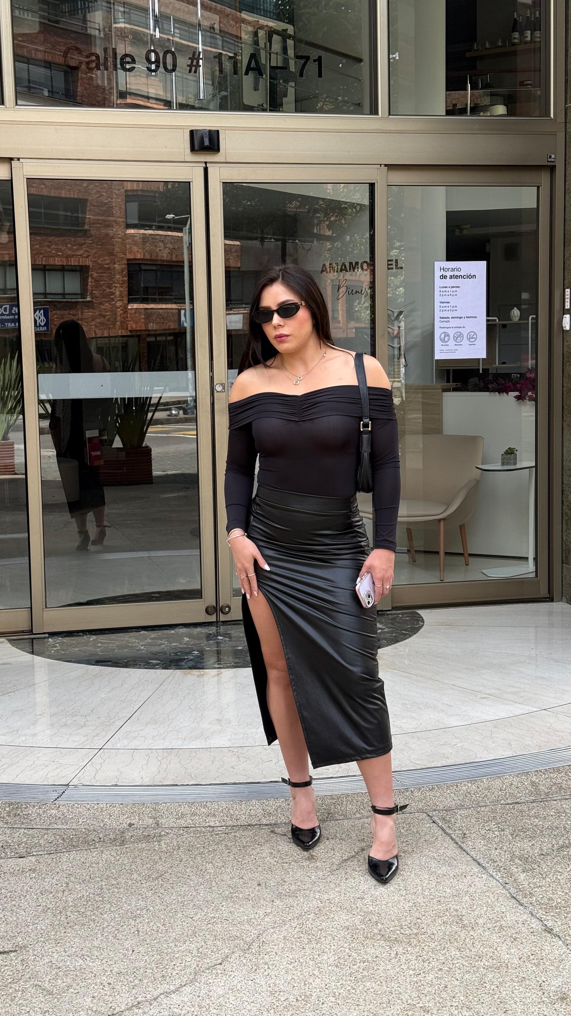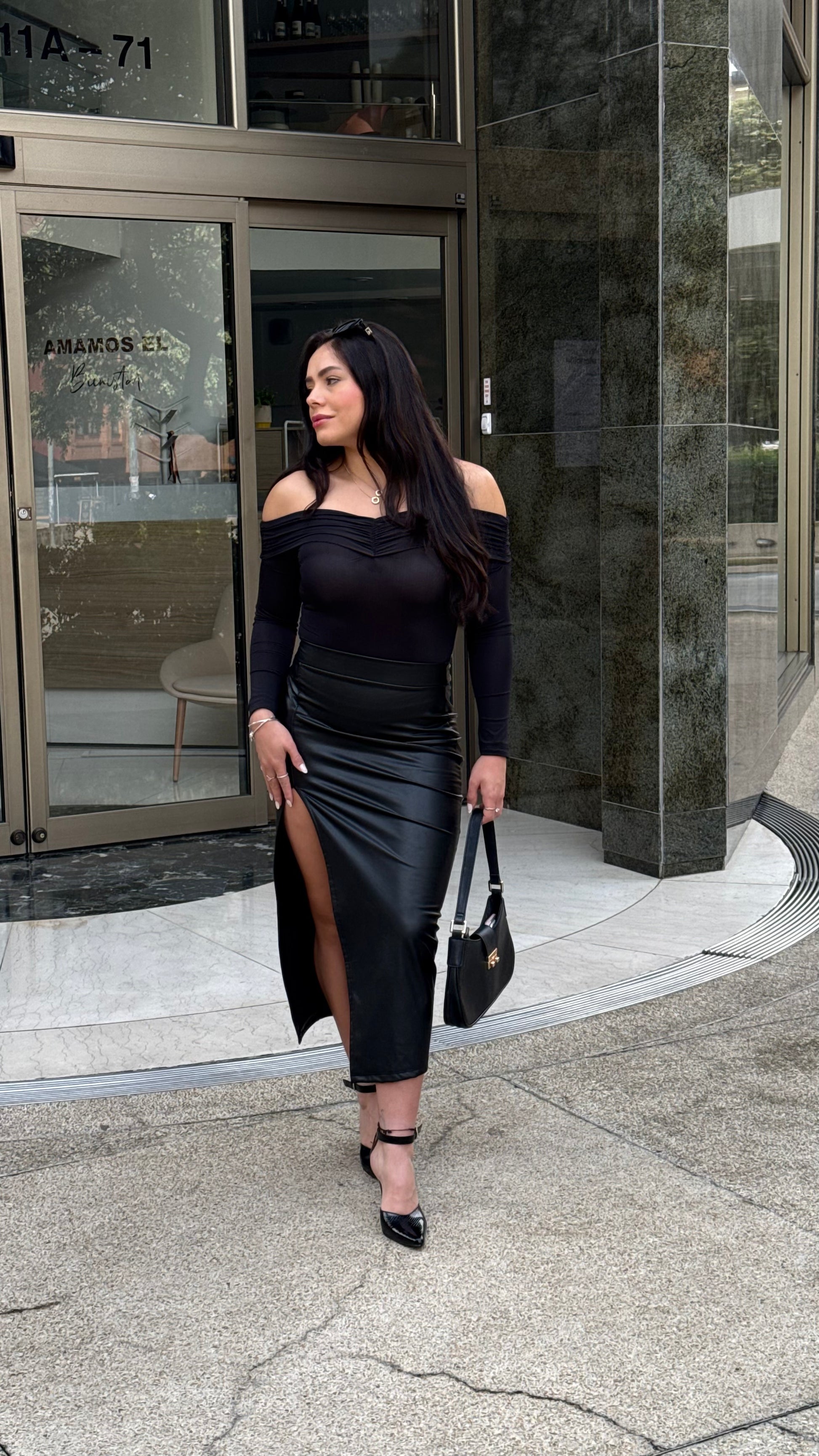 Conquista miradas con esta falda en efecto cuero negro, diseñada con una sensual abertura frontal que añade movimiento y estilo. Su corte ajustado realza la silueta y su acabado brillante le da un toque sofisticado y atrevido. Ideal para looks elegantes, urbanos o de noche.